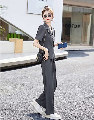 セットアップ レディース ジャケット 半袖 ショート丈 タックパンツ 春 夏 薄手 アシンメトリージャケット 脚長 羽織 前開き 上下 2点セット ゆったり 抜け感 シンプル カジュアル きれい 大人