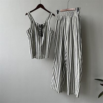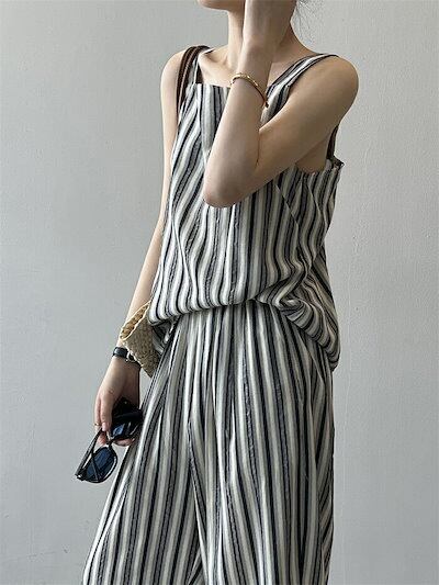 セットアップ レディース 夏 春 2点セット パンツドレス パンツスーツ ノースリーブ ロングパンツ ガウチョパンツ ワイドパンツ ゆったり タンクトップ キャミソール ストライブ柄 韓国風 上下 普