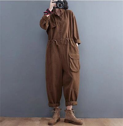 オールインワン サロペット つなぎ レディース 春 秋 大きいサイズ パンツドレス 連体服 無地 オーバーオール オールインワン 長袖 ロングパンツ マキシ丈 ツナギ 古着風 マタニティ ゆったり目