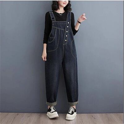 オールインワン デニムサロペット レディース コーデ 秋 サロペット デニム 大きいサイズ サルエルパンツ アシンメトリー 体型カバー ゆったり 楽ちん 大人 デニムワイドパンツ 春 夏 秋 無地