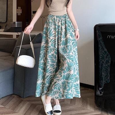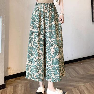 ガウチョ リラックスパンツ ウエストゴム ワイドパンツ フレア レディース 夏 韓国ファッション ボタニカル テロテロパンツ リゾート スカパン 柄