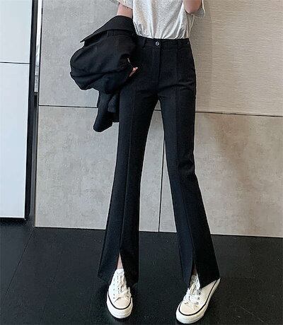ロングパンツ レディース スリットパンツ 春 秋 秋 無地 スリット パンツ きれいめ ストレッチパンツ 9分丈 ロング丈 ボトムス ズボン フレア スラックス 黒パンツ フロントスリット おしゃれ