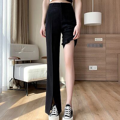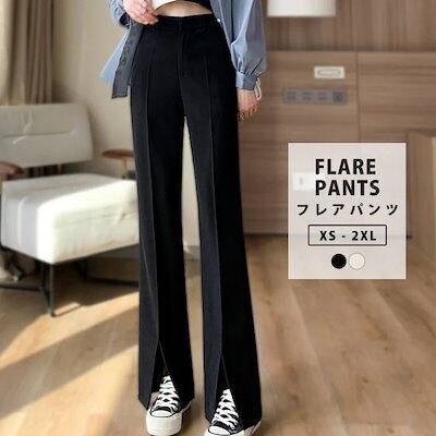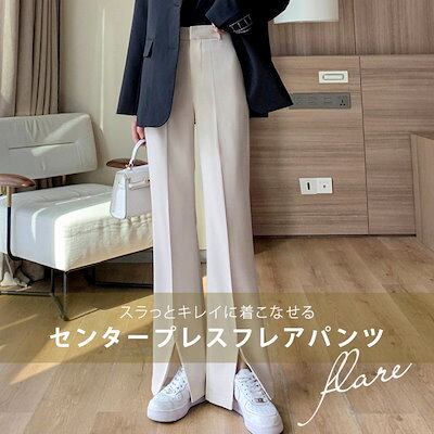 フレアパンツ レディース スラックス きれいめ ボトムス ズボン 10分丈 薄手 おしゃれ かわいい 白 黒 センタープレス フロントスリット ストレート タック ベルトループ ファスナー サイ