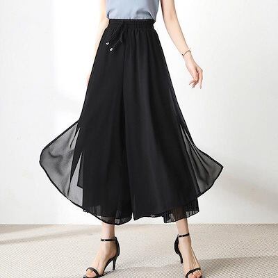 ガウチョパンツ レディース ワイドパンツ 裾プリーツ 切り替え ロングパンツ シフォン フレアパンツ 接触冷感 春夏 ひんやり 涼しい