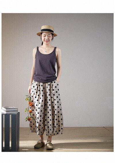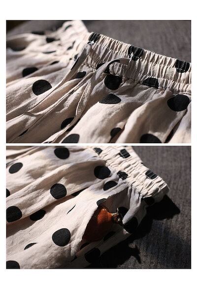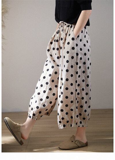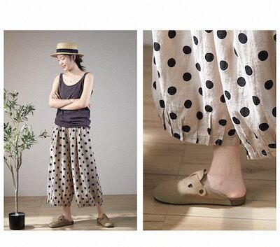ワイドパンツ リネン コットン 夏 レディース パンツ ガウチョパンツ 綿麻風パンツ ドット 水玉柄 チノパン ズボン 九分丈 ボトムス イージーパンツ バギーパンツ 大きいサイズ ゆったり 体型カバ