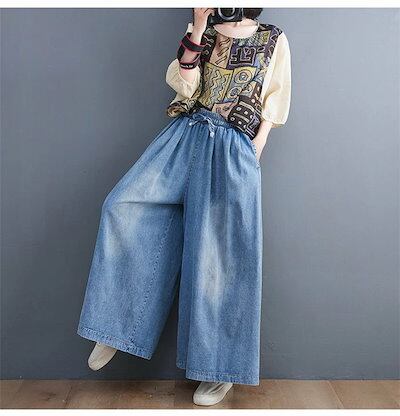デニムパンツ ワイドパンツ レディース ガウチョパンツ デニム ゆったり ボトムス ジーパン チノパン バギー イージーパンツ 柔らか 森ガール デニム ズボン ウエストゴム 大きいサイズ 体型カバー