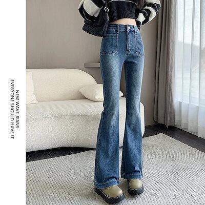 メガ割 裏起毛パンツ デニム レディース フレアパンツ 防寒 寒さ対策 中厚手 ズボン シンプル ストレッチ 伸縮性 黒 ポケット 美脚パンツ ブーツカット 10分丈 ベルトループ 小さいサイズ お出