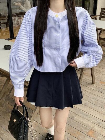 2024秋冬トップス シャツ 長袖 ストライプ ボタン 襟 スタンダードカラー 秋 青 ブルー おしゃれ かわいい 韓国ファッション レディース お出かけ