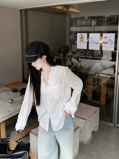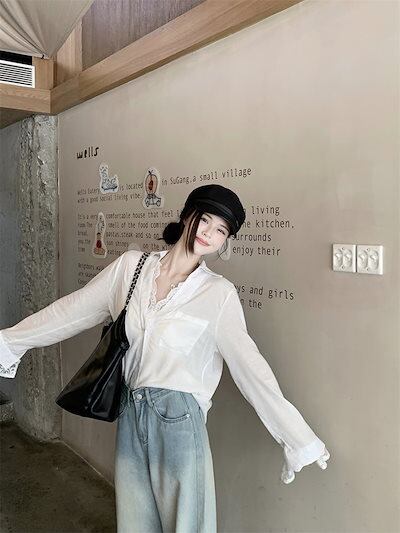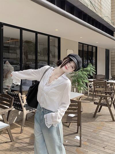 2024秋冬トップス シャツ 長袖 Vネック レース ガーリー 甘め キュート 秋 白 ホワイト おしゃれ かわいい きれいめ 大人っぽい 韓国ファッション レディース お出かけ