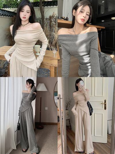 2024 秋冬 トップス 長袖 かわいいラウンドネック トレーナーTシャツ 肌見せ レディース ストレート韓国風ルーズゆったりカジュアルおしゃれサイズシルエットファッション系コーデ衣装上下セットアップ
