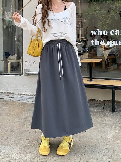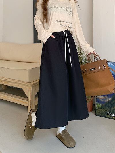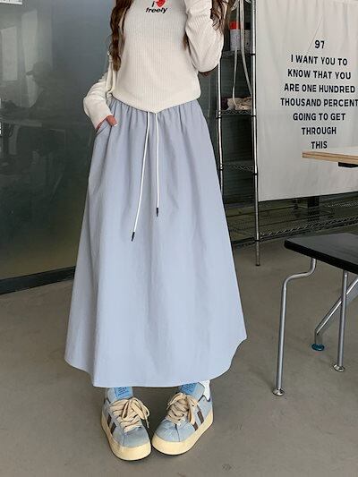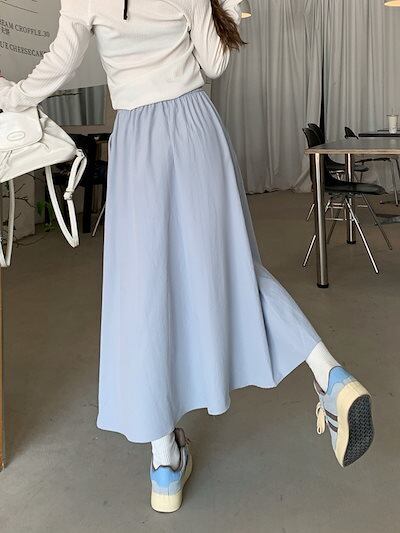 2024 秋冬スカート ミモレ丈 Aライン ウエストゴム ハイウエスト 美脚効果 脚長効果 細見え 秋 白 黒 水色 おしゃれ かわいい 韓国ファッション レディース お出かけ