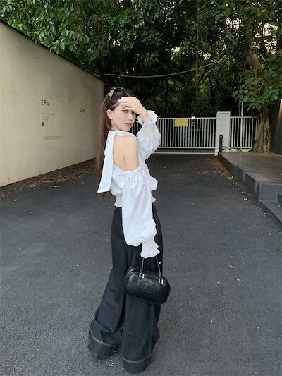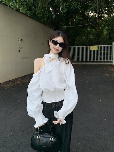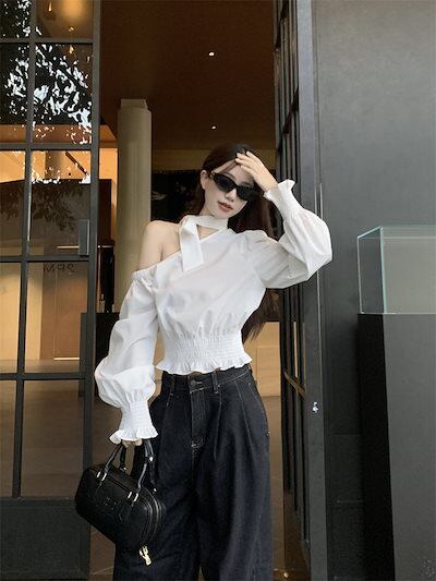 2024秋冬トップス シャツ 長袖 ワンショルダー 肩見せ リボン 秋 白 ホワイト おしゃれ かわいい きれいめ 大人っぽい 韓国ファッション レディース お出かけ