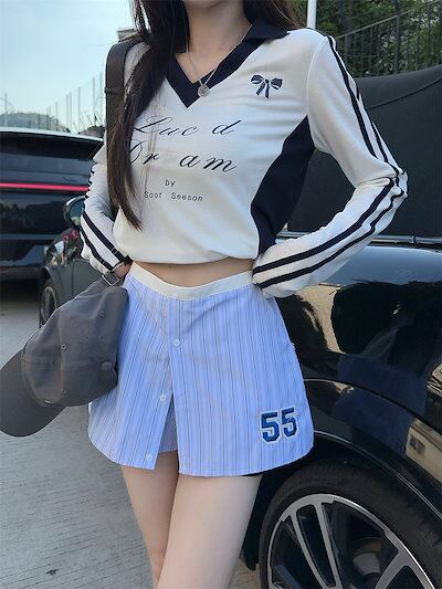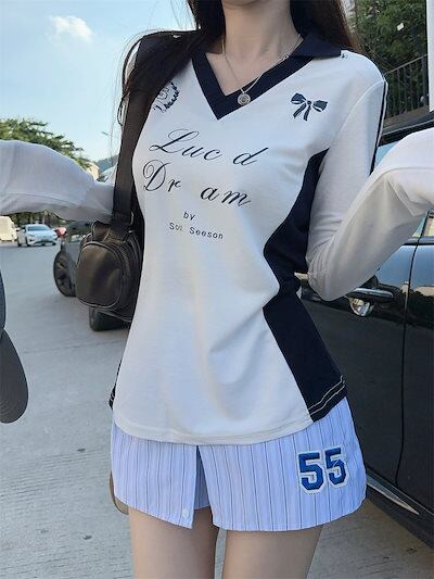 2024秋 長袖 Tシャツ ショート丈 カットソー トップス カジュアル 配色 韓国系ストリート ロゴ へそ出し タイトネックスリーブ 肌見せ T ファッションレディース かわいい風冬トップス