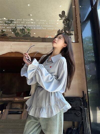 2024夏トップス シャツ 長袖 ボタン 襟 スタンダードカラー ハート キャンディスリーブ ゆったり 細見え 夏 水色 ライトブルー おしゃれ かわいい ガーリー キュート 甘め 韓国ファッション