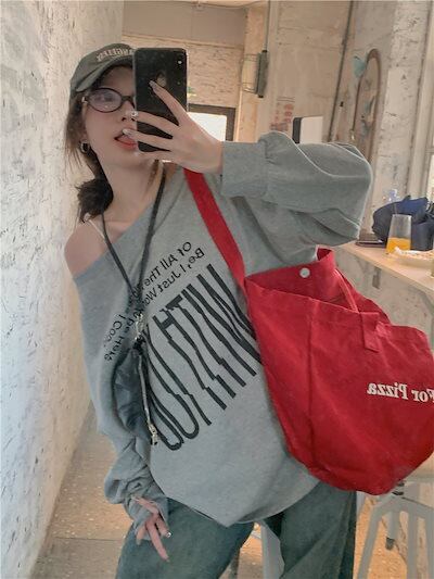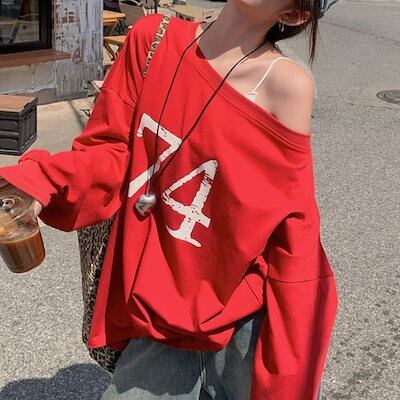 2024夏トップス Tシャツ 長袖 ワンショルダー 肩見せ 数字 74 ゆったり 細見え 夏 赤 おしゃれ かわいい 韓国ファッション レディース お出かけ