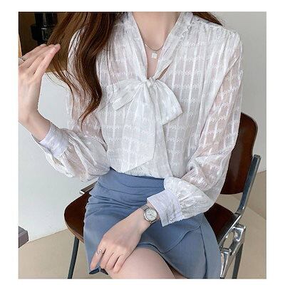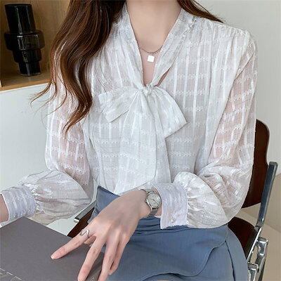 ブラウス レディース 春秋新作 長袖ブラウス 透かし彫り 韓国風 オフィス 白シフォンシャツゆったり きれいめ 蝶結び おしゃれ 着痩せ 大人 通勤