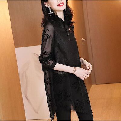 シャツ ブラウス フェイクレイヤード レディース きれいめ 秋 冬 新作 長袖 トップス オシャレ シャツブラウス 上品 ゆったり レース 大きいサイズ着痩せ 黒