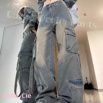 デニムカーゴパンツ レディース ワイド ズボン ジーパン アウトドア ストリート ポケット 韓国ファッション Gパン ジーンズ