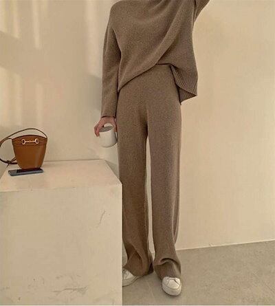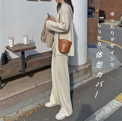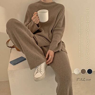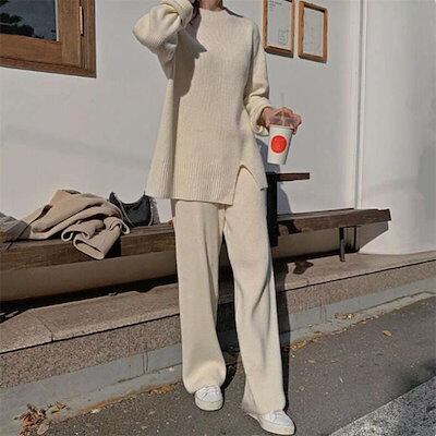 2025新作 韓国風セットアップ ニット レディース ニットセットアップ ニットセーター ニットパンツ プルオーバー リブニット サイドスリット ワイドパンツ 上下セット 長袖 柔らか 無地 秋冬 暖