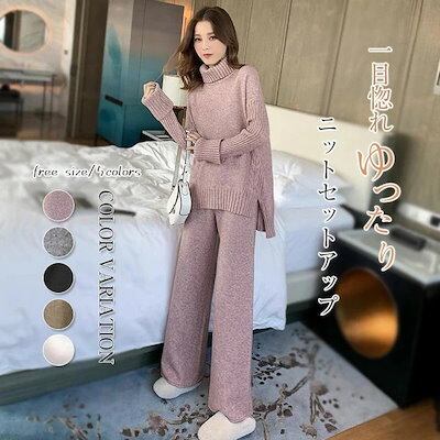 2025新作 韓国風ニット セットアップ レディース セットアップ ニット 上下セット 2点セット パンツスーツ タートルネック ロング丈 プルオーバー ワイドルーズ 通勤 長袖 ゆったり リブニッ