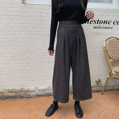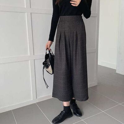ワイドパンツ レディース 秋冬 チェック柄 無地 ガウチョパンツ タック入り 後ろゴム ハイウエスト フレアパンツ パンツ 美脚 おしゃれ カジュアル きれいめ ガウチョ シンプル ワイド 落ち感 フ
