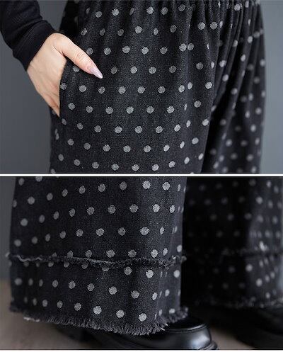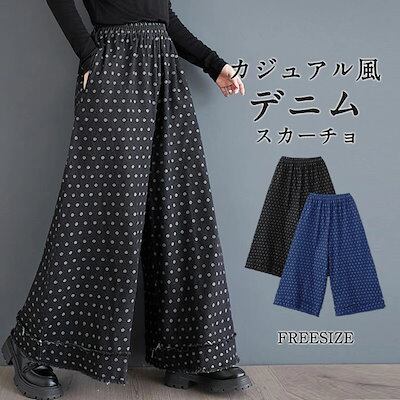 ジーンズ デニムスカーチョ レディース ワイドパンツ スリット ゴムウエスト デニム デニムパンツ きれいめ 股上深め 大きいサイズ 春夏秋冬 フレアパンツ ゆったり おしゃれ ドット柄 水玉 体型カ