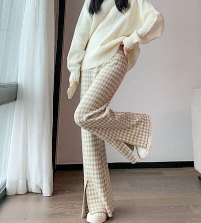 ニットパンツ レディース 伸縮性 ストレッチ 裾スリット ワイドパンツ フレアパンツ ニット 千鳥柄 厚め 暖かめ 保温性 おしゃれ きれいめ 春秋冬 ロングパンツ ボトムス 体型カバー 着痩せ ロン