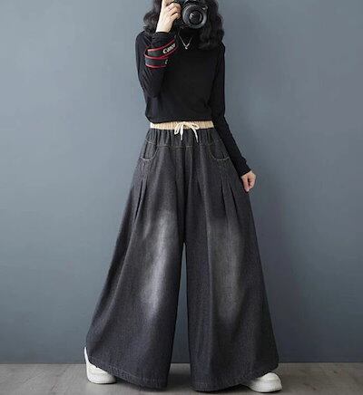 デニムスカーチョ 裏起毛 レディース ジーンズ スカーチョ ロングパンツ ワイドパンツ デニムパンツ きれいめ 股上深め 大きいサイズ 秋冬 フレアパンツ ゆったり おしゃれ 厚め 暖かめ 体型カバー