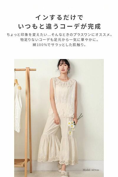ぺチパンツレースロング綿ペチコートレディースパンツ大きいサイズフレアインナーパンツ刺繍裾レースロングペチパンツ重ね着コットン綿天然素材ゆったり下着スカラップレース見せパン裾見せかわ