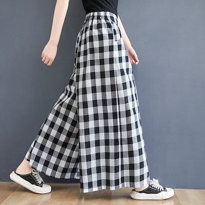 「ファットガール」 ワイドパンツ レディース ハイウエスト ドレープ 夏 綿麻 チェック トラウザーズ ストレートパンツ メガ割