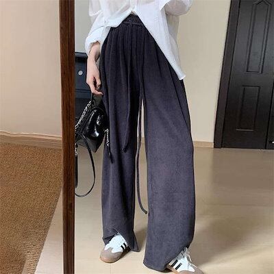冬 秋冬 ゆったり ロング丈 着?せ ワイドパンツ 無地 春 ギャザー ストレートパンツ ズボン ニットパンツ 暖かい ボトムス シンプル ウエストゴム ポケット付 ロングパンツ レディース コットン