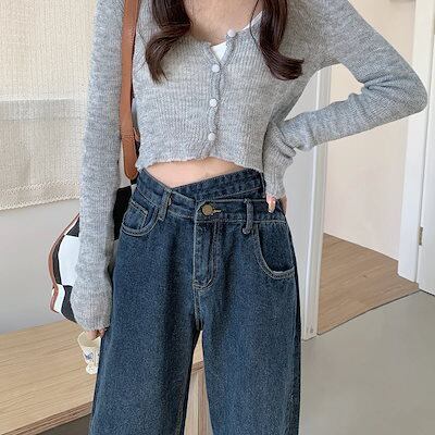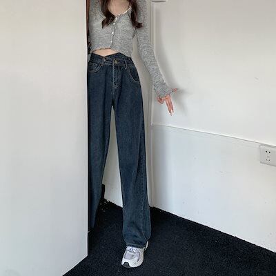 ギャル不規則ウエストジーンズレディース秋のビッグサイズ新型ハイウエストスリムワイド脚ストレートモップロングパンツinsデニムボトムス レディース
