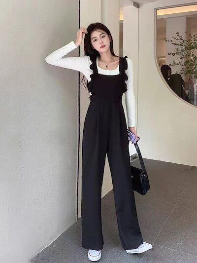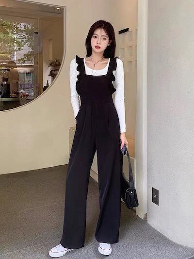 サロペット 気質 ハイウエスト ワイドパンツ オーバーオール 秋冬 レディース ゆったり 着痩せ 黑色 ロングズボン サロペット