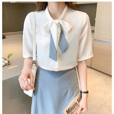ブラウス レディース 40代 春夏新作 オシャレブラウス 白シフォンシャツ リボンネック 半袖トップス 大人 通勤OL ゆったり シャツ30代 50代