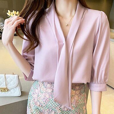 ブラウス レディース 40代 春夏新作 オシャレブラウス シフォンシャツ 五分袖トップス リボンVネックブラウス 大人上品 通勤OL ゆったり シャツ30代 50代