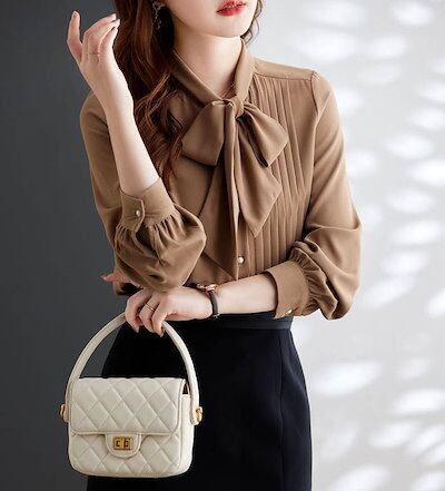 シャツブラウスレディース長袖白きれいめ秋ギャザーシフォンブラウスジョーゼットフリルリボン付きシャツブラウスオフィスビジネストップスフォーマルカジュアルファッション体型カバー着?せ通勤無地シンプル着回し