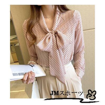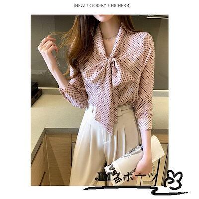 ブラウス レディース きれいめ 春夏秋新作 長袖トップス オシャレブラウス ドット柄 シフォンシャツ リボンvネック 上品 大人 通勤 ゆったり 30代 50代