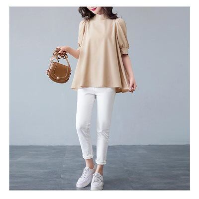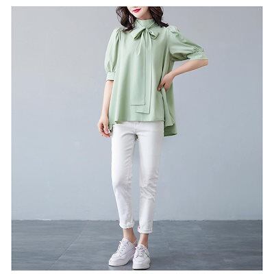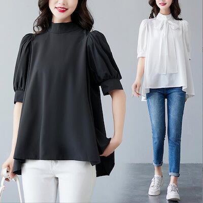 ブラウス レディース 半袖 パフスリーブ ノーカラー ハイネック リボン フォーマル 春夏 パフスリーブリボンフレアブラウス