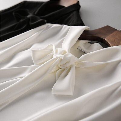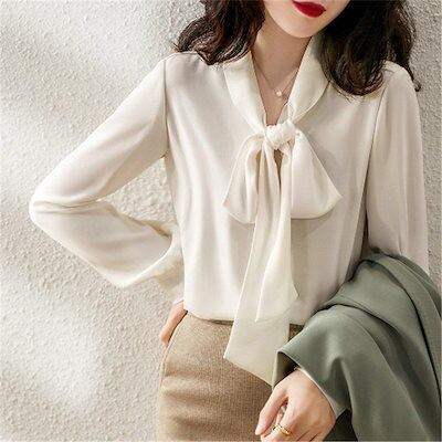 ブラウス レディース 白 黒 ボウタイシャツ シャツ トップス 無地 長袖 リボン シフォン ホワイト ブラック オフィス カジュアル