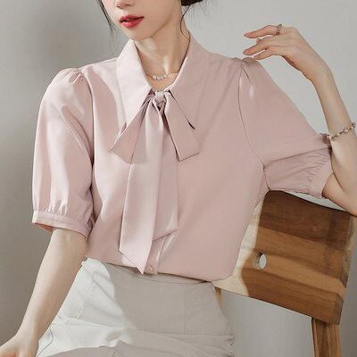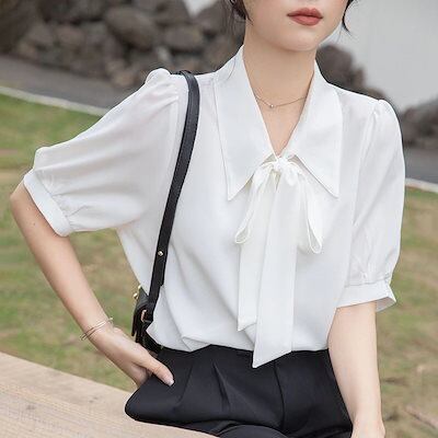 ホワイトシフォンリボンシャツレディース半袖夏デザインニッチ香港スタイル通勤プロフェッショナルトップ多用途レース