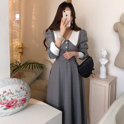 韓国chicの春のチェック ワンピース セレブ レディース 長袖 フレンチ ワンピース ベルト 通勤 OL ファッション 新品追加