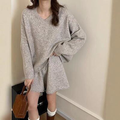 セットアップ 涼しく楽ちんセットアップ2025春の新作おしゃれニットセットアップ ニットスーツゆったりけだるい風セーターセット レディース Vネックニットトップス二点セット