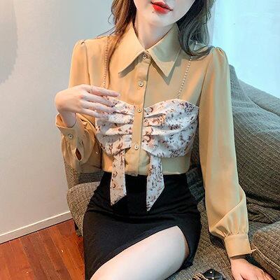 Tシャツ 韓国 カットソー 長袖 ブラウス シフォンブラウス シアーシャツ トップス 体型カバー 大きいサイズ リボン 韓国 シャツ レディース ロングシャツ シースルーシャツ