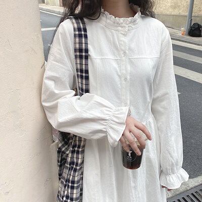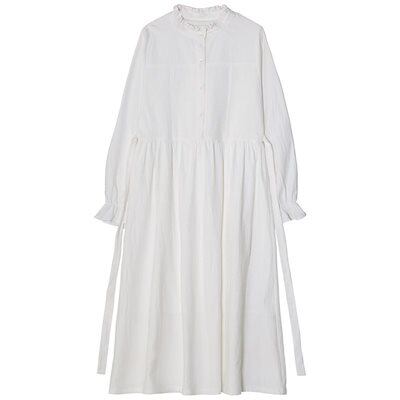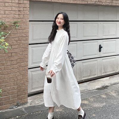 ワンピース 新作 長袖白ワンピース 韓国ファッション 春レトロミディアム白スカート