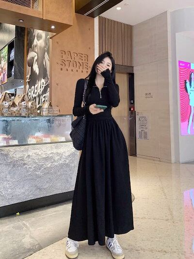 ワンピース ?袖 黒いワンピース 韓国ファッション 着痩せ 百掛け ロングスカート