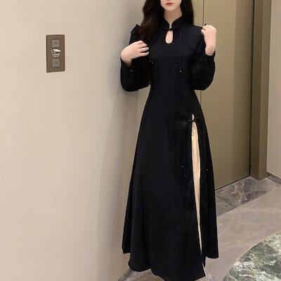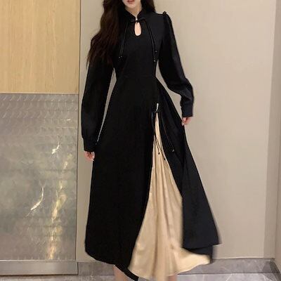 ワンピース 改良チャイナドレス 着痩せ ワンピース春 韓国ファッション 高級感ウエストロングスカート