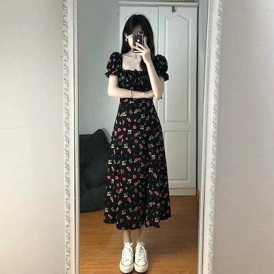 ワンピース 韓国ファッション ブラックの花柄ワンピース新型ロングスカート