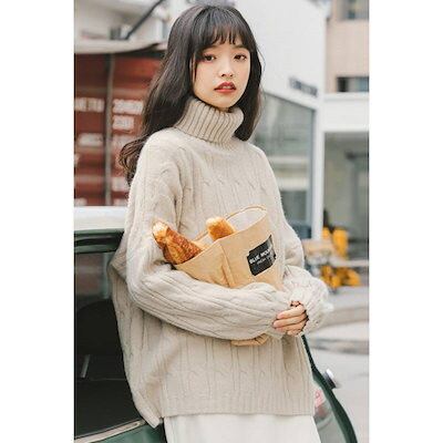 カシミヤタッチ ベーシックニット タートルネックニット 厚手 ツイスト 怠惰風 セミロング セーター ゆったり カジュアル ニットカーディガン裏起毛ファッション