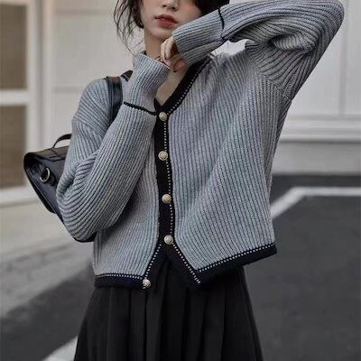 カシミヤタッチ ベーシックニット 秋冬の新韓系優しくだるくてゆったりしたVネック痩せた穴が見える色のセーターコートの女性ファッション