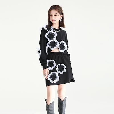 【J.Fashion】 花飾り ブラウス 春夏 スウェット レディース 長袖 ドッキング トップス 関連商品は店で購入可能 メガ割 福袋 T